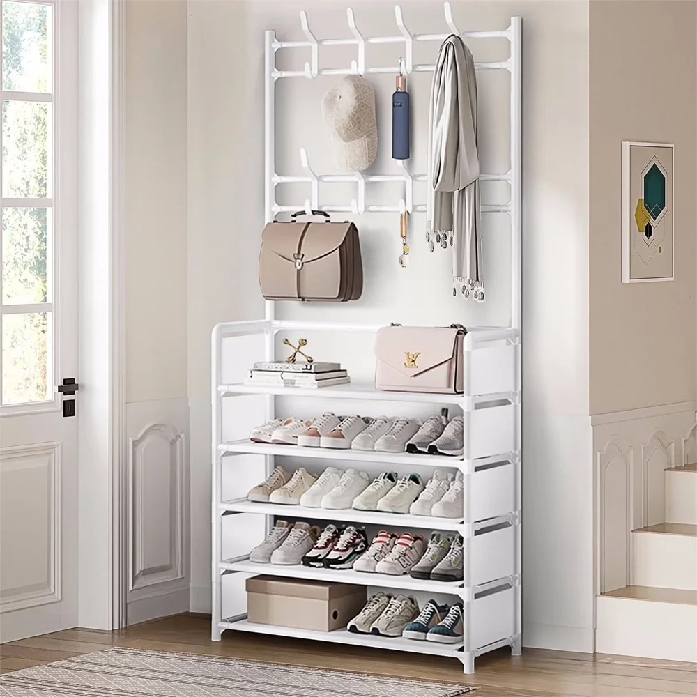 3-in-1 Coat Rack with Shoe Storage & 8 Hooks | 5 Tier Entryway Organizer, Freestanding Metal Clothes & Shoe Rack for Hallway Bedroom