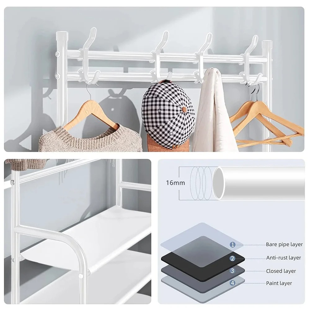 - 3-in-1 Design – Coat rack, shoe rack & storage shelf combined